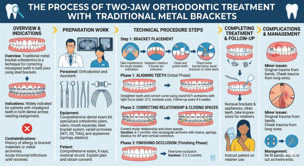 The process of two-jaw orthodontic treatment with traditional metal brackets